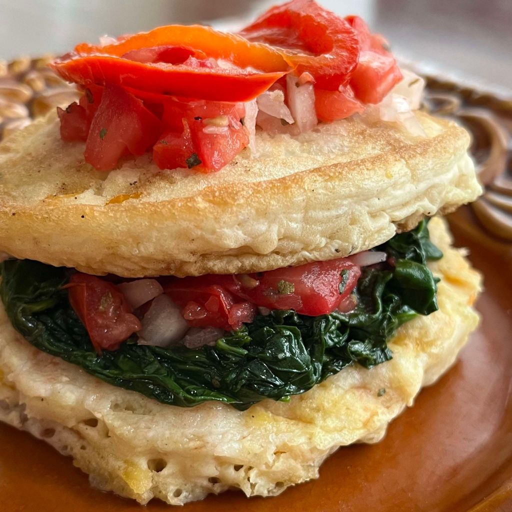 - Lay one pancake on a plate. Add about 2 tbsp of spinach and a 1 tbsp of the relish. Add another pancake on top. Add about 1 tbsp relish and a few strip of pepper.