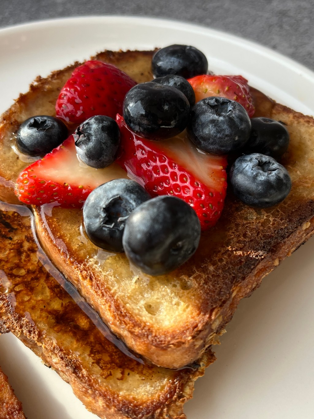 Instead of eggs, I use a custard-like mixture made from silken tofu, soy milk, cornstarch (for that extra crispy texture), a touch of kala namak (for that classic eggy flavor), zero-sugar sweetener, and a hint of cinnamon. The cornstarch helps the coating crisp up beautifully in the pan, giving you that perfect golden-brown finish.